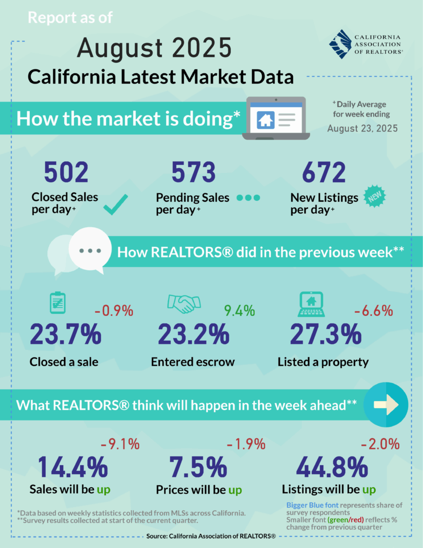 Market experts advise sellers to price competitively. Buyers should monitor inventory and act swiftly when new listings appear. For full statewide data and weekly updates, visit the California Association of REALTORS® at www.car.org.